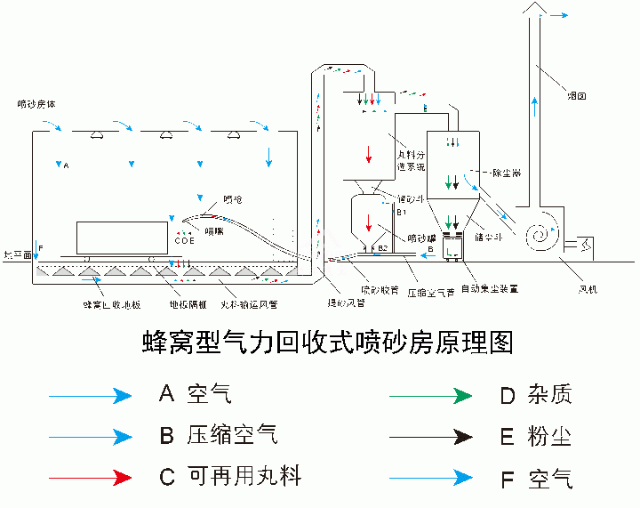 噴砂房砂料回收、分離及除塵系統(tǒng)的工作原理是:噴砂房外的氣流經(jīng)噴砂房?jī)蓚?cè)的百葉窗進(jìn)入噴砂房?jī)?nèi),之后通過噴砂房頂部的勻流板進(jìn)入噴砂工作室,在噴砂房的橫斷面形成自上而下的氣流,把噴砂房?jī)?nèi)的砂料、粉塵、清理物等通過蜂窩式吸砂地板進(jìn)入磨料分離系統(tǒng)中,通過磨料分離器,將磨料及粉塵物分開,有用的砂料進(jìn)入噴砂罐內(nèi)繼續(xù)循環(huán)使用,粉塵及污物則隨氣流進(jìn)入除塵系統(tǒng)內(nèi),經(jīng)過除塵系統(tǒng)的過濾,干凈空氣排入大氣,粉塵及污物則儲(chǔ)存在粉塵筒中等待定期清理。
